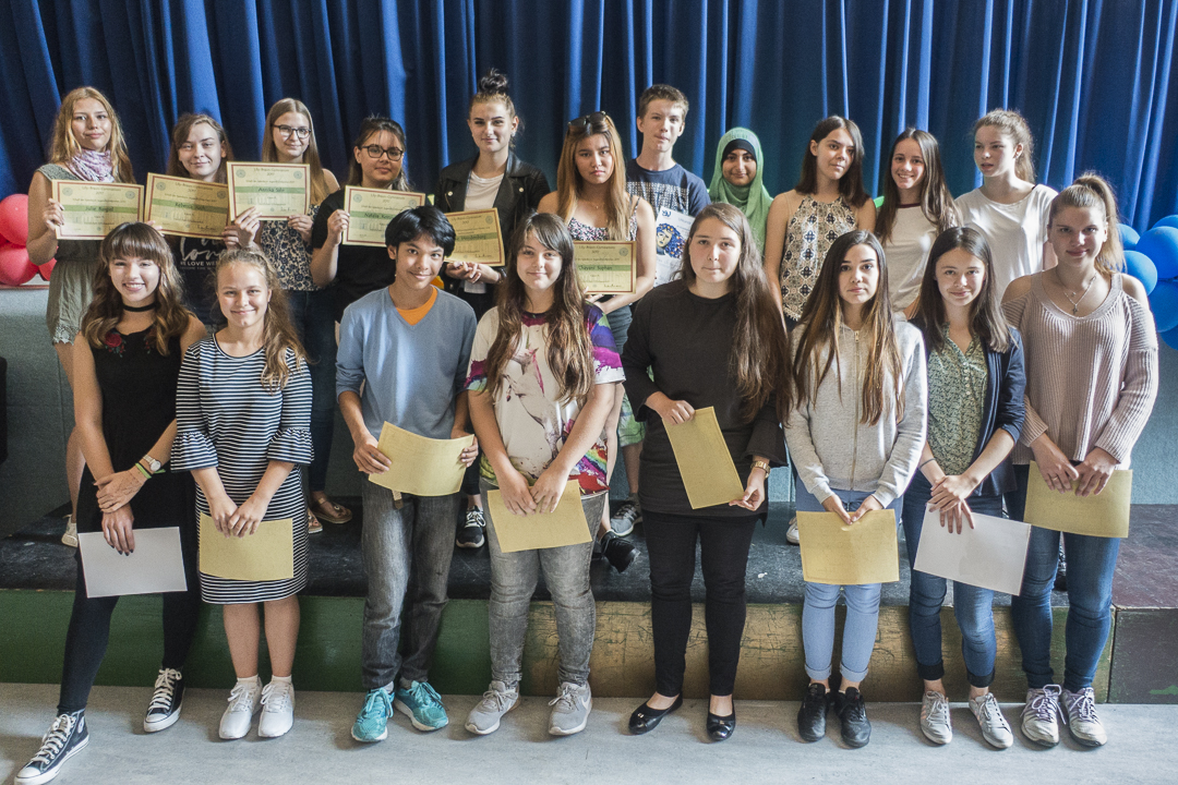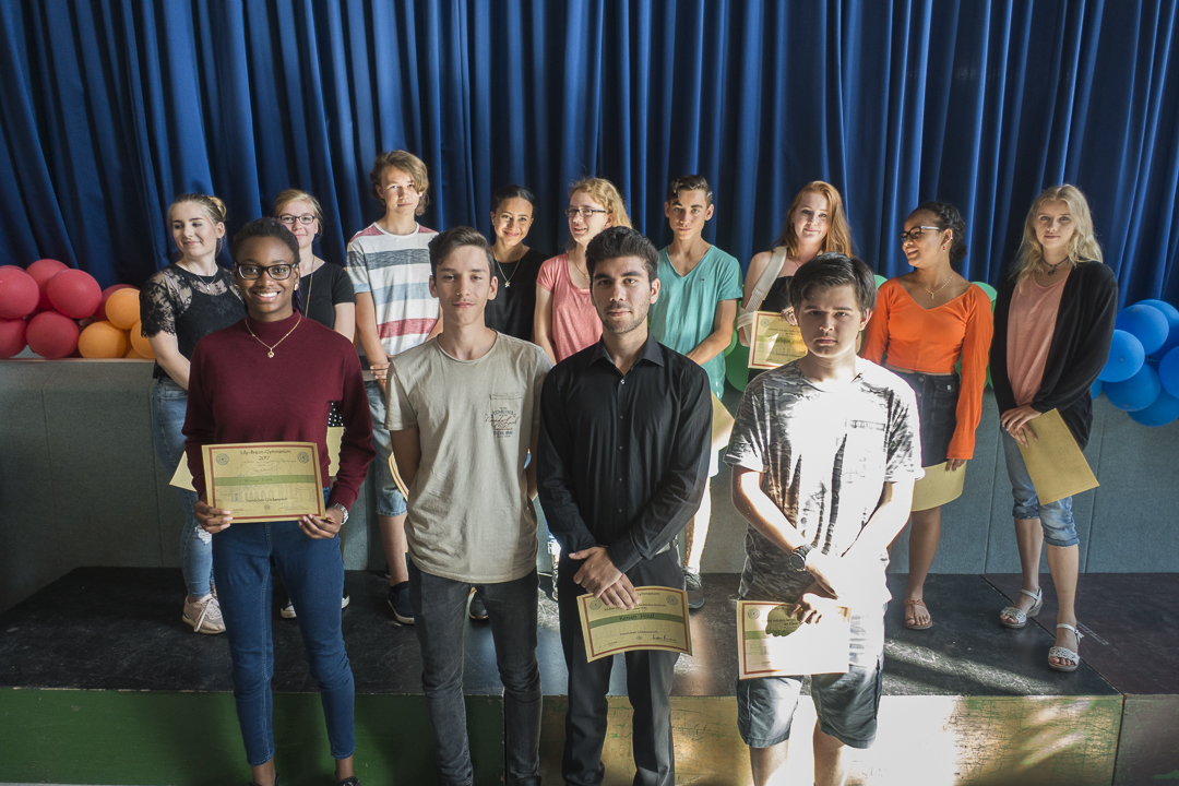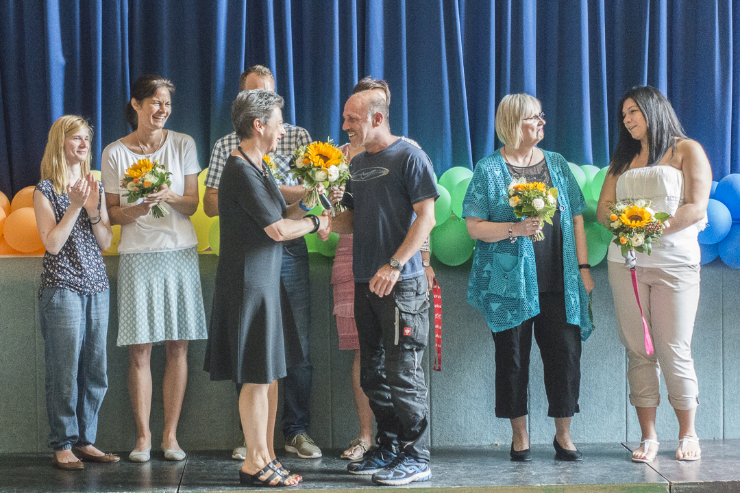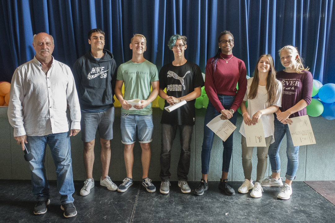 Weitere Urkunden bekamen nicht nur die Besten der Bundesjugendspiele und die Gewinner*innen des Europäischen Kunstwettbewerbs bzw. des Spandauer Jugendkunstpreises, sondern auch diejenigen, die sich besonders in der Schule engagiert haben. Vom Schulsozialprojekt Haiti Care e.V. über die Theater-AG bis zur Organisation und Begleitung der Sommer- und Winterkonzerte gab es in diesem Schuljahr wieder viele Möglichkeiten, sich über den Unterricht hinaus einzubringen. Gleiches gilt für die Lehrerkolleg*innen, von denen unsere Schulleiterin einige auf die Bühne holte, um ihnen für ihre Arbeit zu danken. Großen Applaus ernteten auch Frau Khantzian, Frau Sabic und Herr Hermann, die als Sekretärinnen bzw. Hausmeister ganz viele kleinere und größere Probleme lösen – und immer für die Schüler*innen da sind.