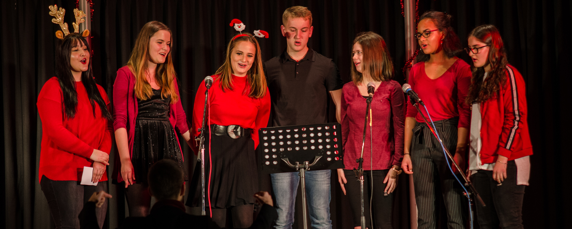 Nach dem mutigen Auftritt von sieben Schülerinnen des Musik-Leistungskurses, die eigenverantwortlich das mehrstimmige „Mary did you know“ einstudiert hatten, schickte Herr Hüpping in seiner „Aley-Rede“ die besten Wünsche an den dieses Jahr leider verhinderten Musikkollegen. Er bedankte sich bei allen am Winterkonzert beteiligten und holte sie für Geschenke und das Gruppenfoto vor die Bühne. Zum Abschluss wurden dann alle zum Singen aufgefordert, der Wahlpflichtkurs Musik auf der Bühne sang gemeinsam mit dem Publikum. Es war der harmonische Schlussakkord eines tollen Konzertabends.