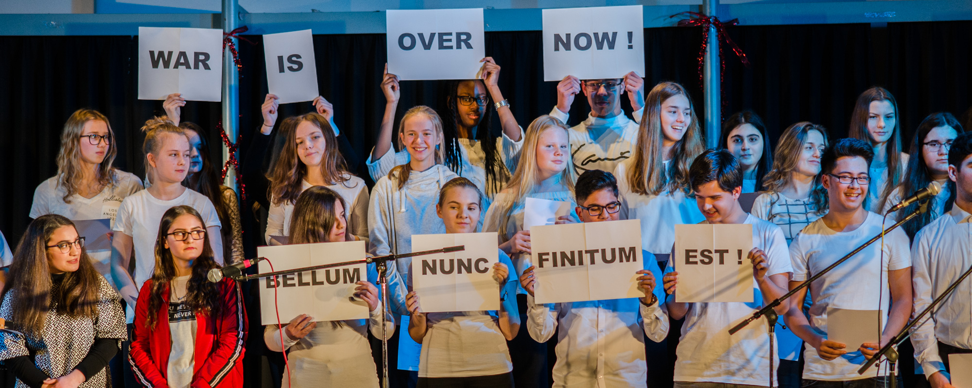 Als besonders engagiert erwies sich wieder einmal Herr Diße-Runte, der als Lateinlehrer regelmäßig bei unseren Schulkonzerten auftritt. Mit dem Wahlpflichtkurs sowie dem Grundkurs hatte er den höchstselbst ins Lateinische übersetzten Klassiker „Happy Christmas“ eingeübt und begleitete seine Schüler*innen mit der Gitarre. Die positive Botschaft des Liedes veranschaulichte der Chorum Latinum mit Hilfe von Plakaten: Bellum nunc finitum est – Der Krieg ist jetzt vorbei.