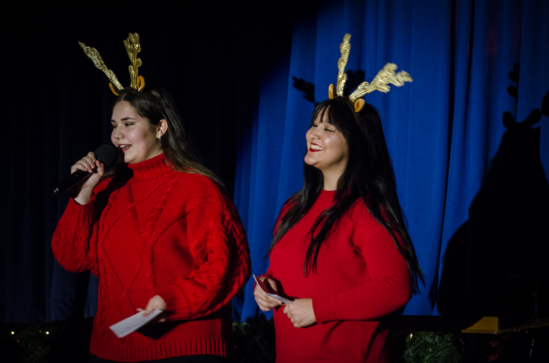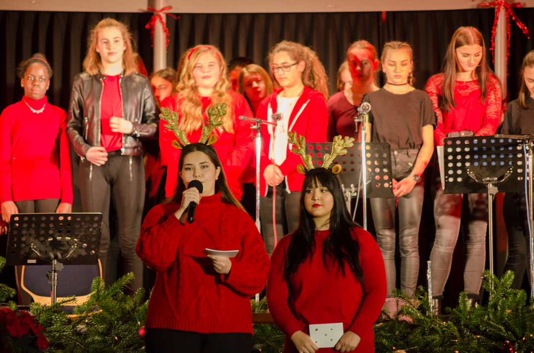 Bevor die Moderatorinnen Alena und Marija das Publikum begrüßten, fand sich der Chor von Herrn Both und Frau Apel für das erste Stück zusammen. Der choreographierte Einmarsch erzeugte von Beginn an eine besinnliche Stimmung: Ein Teil der Schüler*innen kam im Schein der Lichterketten singend in die Aula, stieg auf die Bühne und vereinte sich dort – auch akustisch – mit den übrigen Sänger*innen.