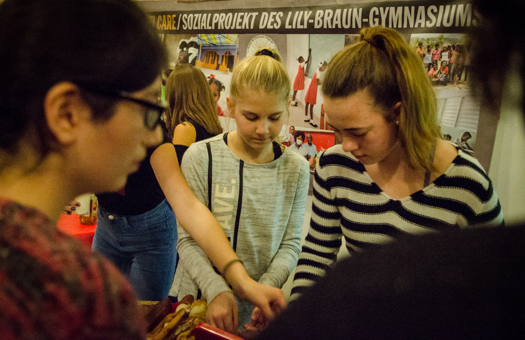 Als es eine kleine technische Unterbrechung gab, sprang Frau Kaufmann kurzerhand ein. Sie bat unsere ehemalige Lehrerin Frau Großmann nach vorne und bedankte sich für ihr langjähriges Engagement im Rahmen des Schulsozialprojekts Haiti Care. Deren Initiatoren waren persönlich anwesend. Oder, wie Frau Großmann scherzte: „Ja, es gibt sie wirklich!“ Sie überreichte dem Ehepaar Karsch einen Scheck über 1000 Euro. Das Geld war bei verschiedenen Aktionen wie Suppenverkauf im Lehrerzimmer, Essensständen bei Konzerten oder auch den Bundesjugendspielen zusammengekommen.