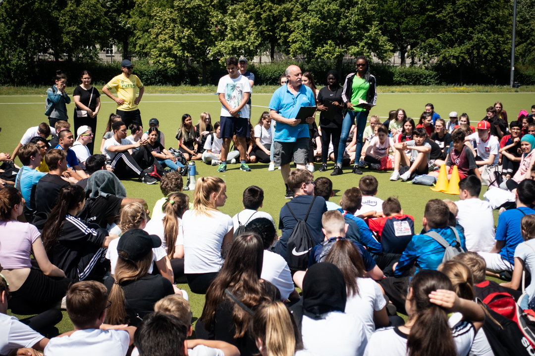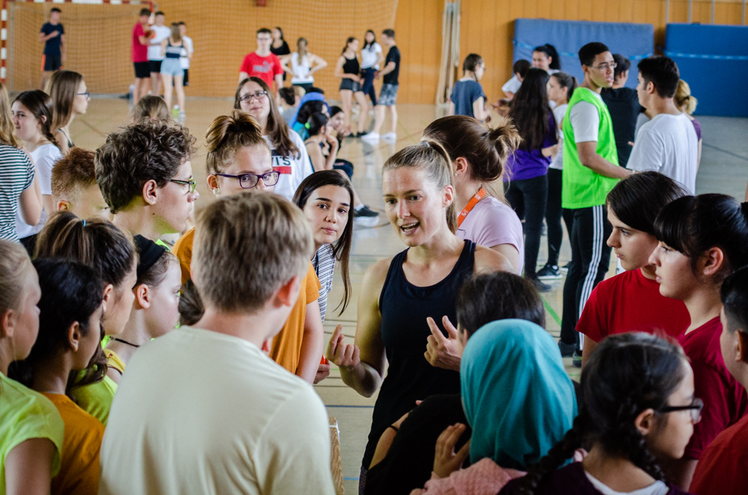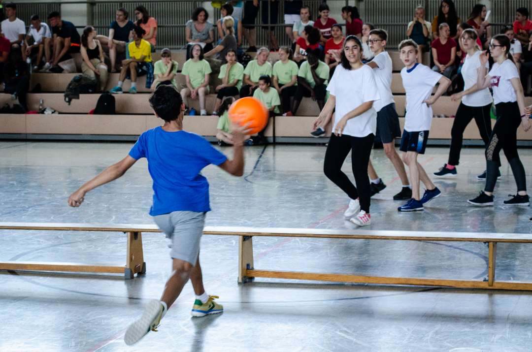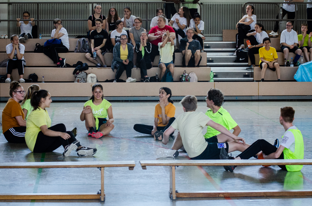 Auch wenn Hitze bei unserem Sportfest mittlerweile Tradition hat, ist es jedes Jahr aufs Neue eine Herausforderung - und es kommen die gleichen Fragen: Wieso sind die Finalspiele eigentlich in der absoluten Mittagshitze? Kann man hier in der Halle nicht noch ein paar Fenster öffnen? Liebe Kinder (und Lehrer_innen), habt ihr euch auch alle brav mit Sonnencreme eingeschmiert? Trotz wolkenlosen Himmels und weniger Schattenplätze bekam aber auch diesmal niemand einen Sonnenstich oder kippte wegen Sauerstoffmangels um. Im Gegenteil...